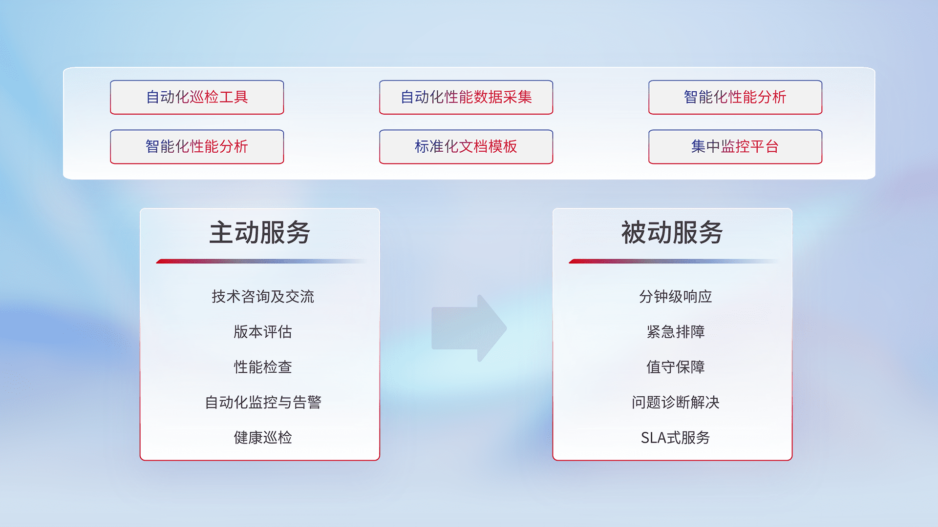 智能化工具和标准化文档,,保障服务质量,,,提供主动服务(包含技术咨询、、、、版本评估、、性能检查、、、、自动化监控与告警、、健康巡检)和被动服务包含(分钟级响应、、紧急排障、、、、值守保障、、问题诊断解决、、、、SLA服务)。。。
